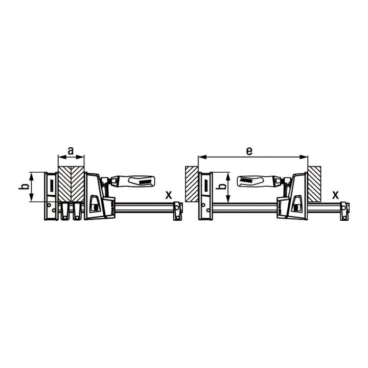 variable for clamping and spreading - large, parallel clamping surfaces made of impact-resistant and break-proof polyamide - glue-repellent, removable protective caps - additional workpiece supports prevent direct contact of the workpiece with the rail when the clamping depth is fully utilised - also ideally suited for precise adjustment of corners or stepped edges - 2-component handle - Special product benefits: - Clamping force up to 8000 N - Infinitely adjustable and fixable upper section - Can be repositioned for spreading without tools
