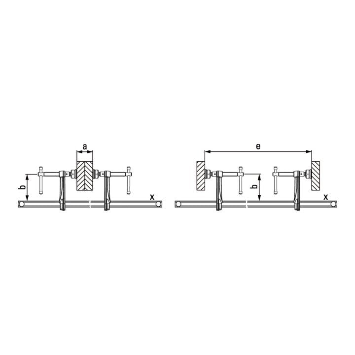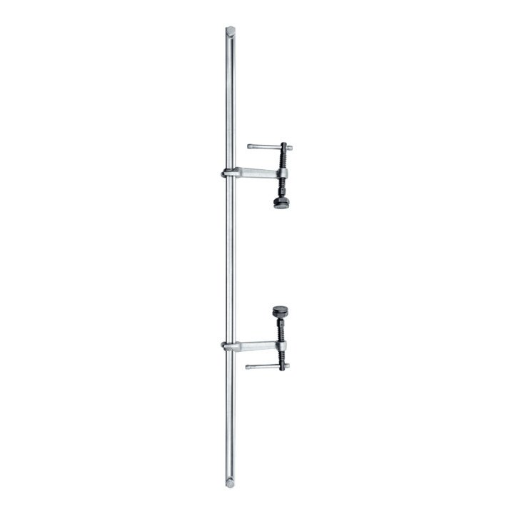 variable high-performance screw clamp with rail made of cold-drawn and galvanised profile - 2 forged tempered steel sliding arms - can be repositioned for spreading without tools - the clamp can be pushed through openings in the workpiece - clamping force up to 6500 N (for clamping widths up to 2000 mm) or 9000 N (for clamping widths of 3000 mm) - heat-resistant 35° swivelling special pressure plate (for clamping widths up to 2000 mm) - with sintered steel insert for clamping widths of 3000 mm