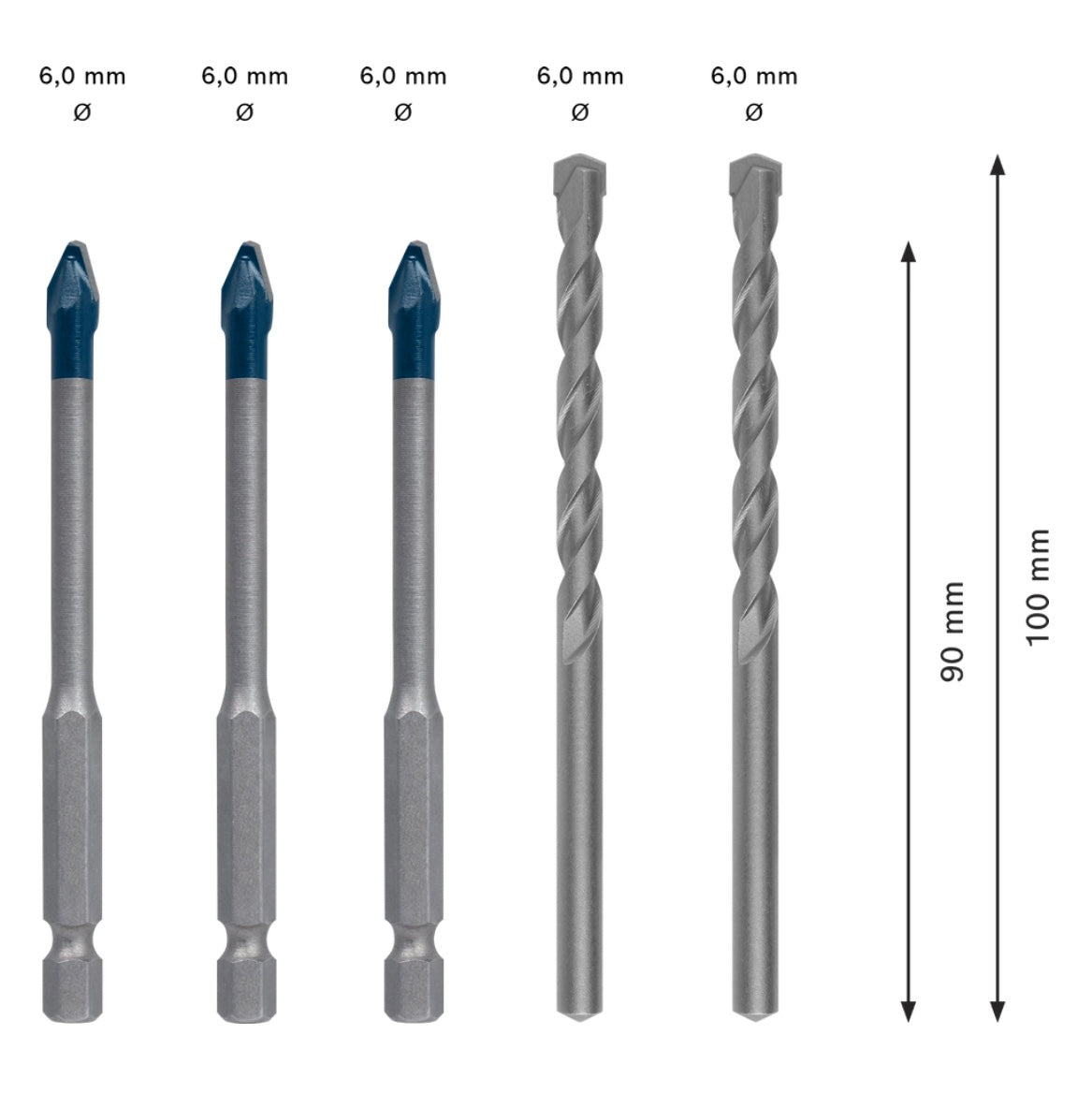 - 5x brocas Bosch EXPERT HEX-9 HardCeramic (3x 6,0 x 90 mm / 2x 6,0 x 100 mm)