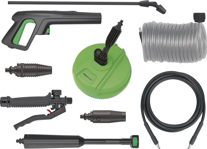 - 8 m high-pressure hose with hose reel, manual spray gun, jet pipe with multifunction nozzle, spot jet nozzle, water filter