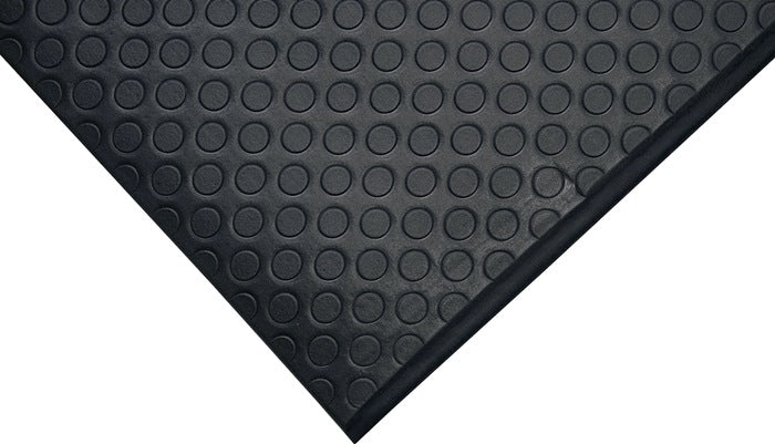 single-layer, ergonomic workplace mat (made of foam) with non-slip studded surface - ideal for workplaces with low to medium loads - suitable for dry indoor areas - has a cold-insulating effect on concrete floors - bevelled mat edges reduce tripping hazards - with yellow edges for improved visibility - fire protection tested in accordance with BS EN 13501-1 - mat thickness 9.5 mm