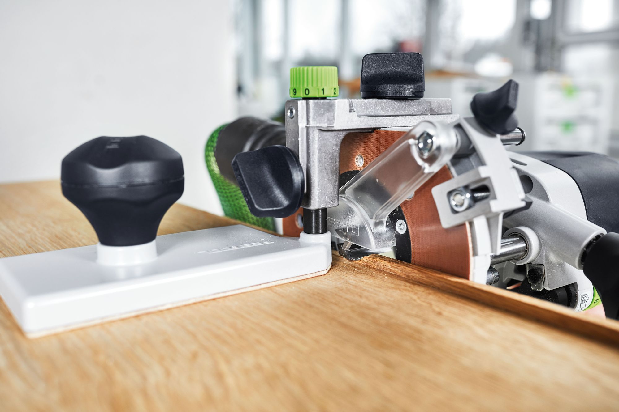 La gran superficie de contacto de la placa canteadora permite guiar la fresadora de forma segura. En combinación con el brazo angular WA-OF se puede ajustar con precisión la profundidad de fresado. Especialmente indicado para fresado de cantos a ras.