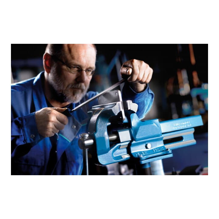 forged steel - guaranteed unbreakable - with forged and machined pipe clamping jaws opening to the front - large deep clamping option - protected spindle with two-start trapezoidal thread for quick opening and closing - guide can be readjusted with just one central screw - large guide surfaces machined on all sides - hardened clamping jaws - anvil surface for straightening and upsetting work - scratch and impact-resistant surface thanks to high-quality powder coating - galvanised spindle spanner with riveted steel retaining rings - Made in Germany