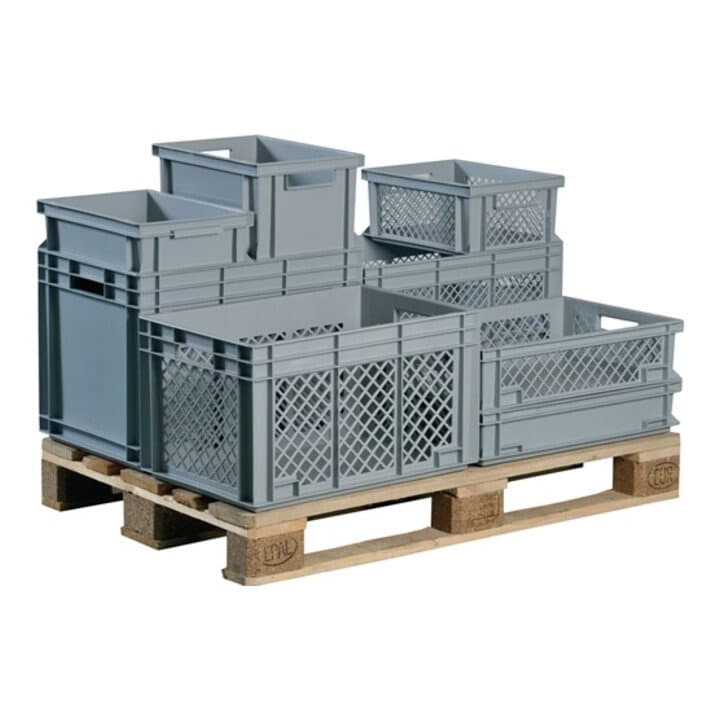 made of polypropylene - for versatile use in storage and order picking - adapted to Euro pallet dimensions - resistant to most acids and oils - food-safe - temperature-resistant from -20° to +80° - grey colour - closed base, perforated side walls