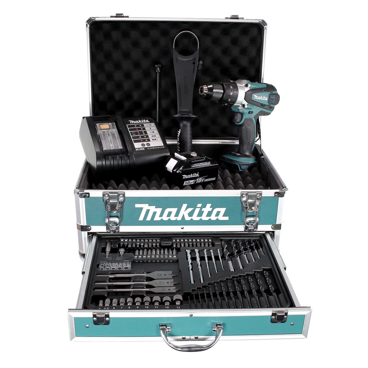 Taladro percutor inalámbrico Makita DHP 458 SFX4 18 V 91Nm + 1x batería 3,0Ah + cargador + 70 piezas. Juego de brocas + estuche