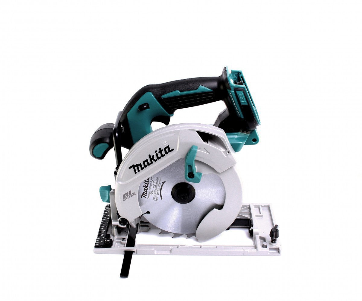 The Makita DHS 680 18V Li-Ion cordless circular saw impresses with its powerful brushless motor (brushless) and automatic speed regulation thanks to Automatic torque Drive Technology for optimum performance for every requirement. The Makita DHS 680 is perfect for roofing work and interior work. The tool has a long service life thanks to the brushless and therefore low-wear motor technology. The cordless portable circular saw can be tilted by up to 50° and a blowing device keeps the application area clean at all times. A bright double LED ensures optimum visibility when working and a practical bracket allows the Makita DHS 680 cordless portable circular saw to be hung up.