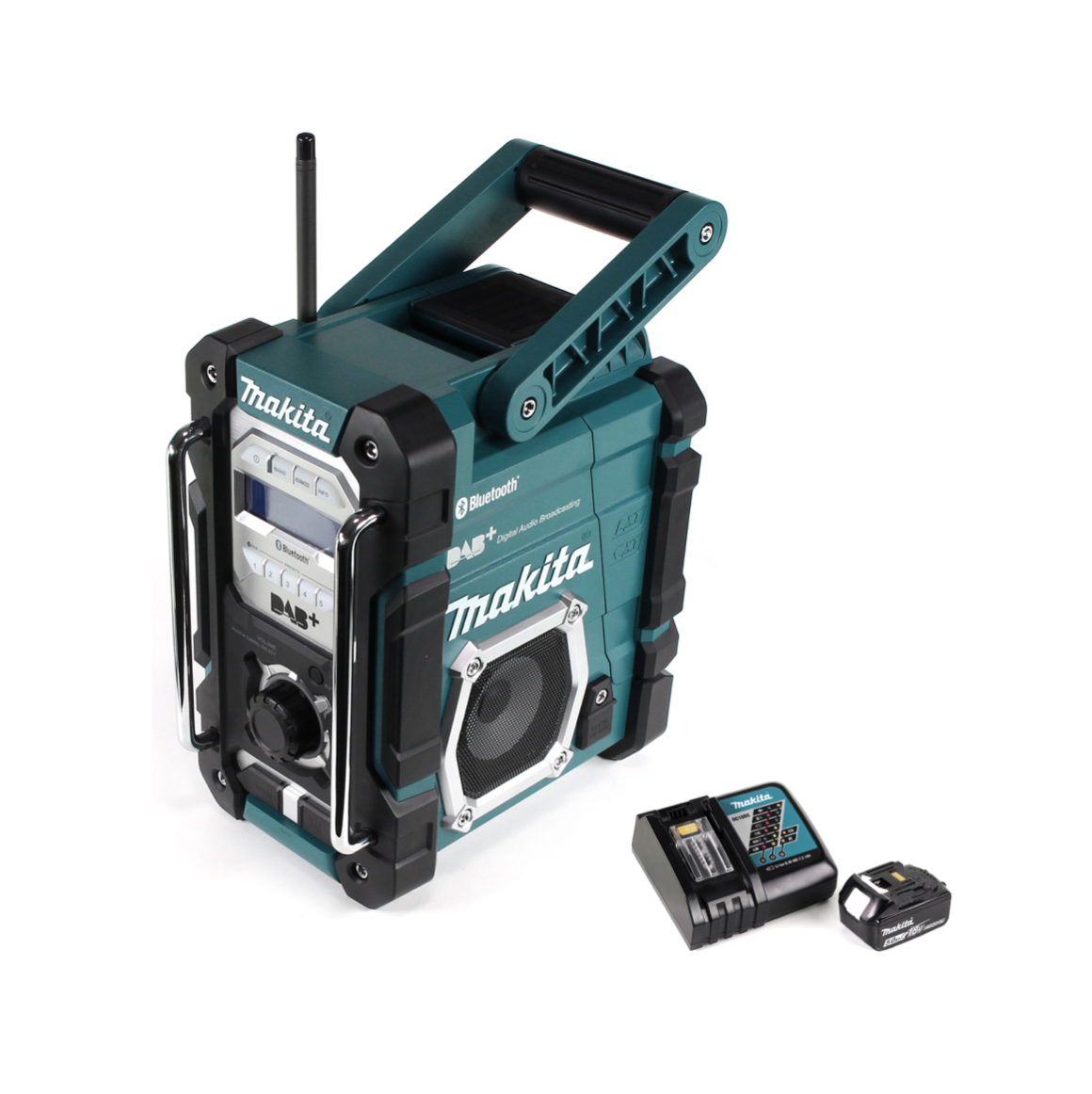 La radio de obra Bluetooth DMR 112 de Makita es adecuada para recibir DAB, DAB+ y FM. Está equipado con un puerto USB y un puerto Aux para cargar un celular o tableta y reproducir música. La radio puede funcionar con todas las baterías de iones de litio de Makita de 7,2 a 18 V, pero no con baterías Maktec o de la serie G. Se incluye un adaptador de corriente para proporcionar energía permanente a la radio. Sin embargo, esto no es adecuado para cargar las baterías. El transmisor se puede ajustar con precisión a través de la gran pantalla digital. La carcasa tiene protección contra salpicaduras hasta el grado de protección IP64. Por lo tanto, la radio es el compañero ideal en la obra, incluso en condiciones climáticas adversas.