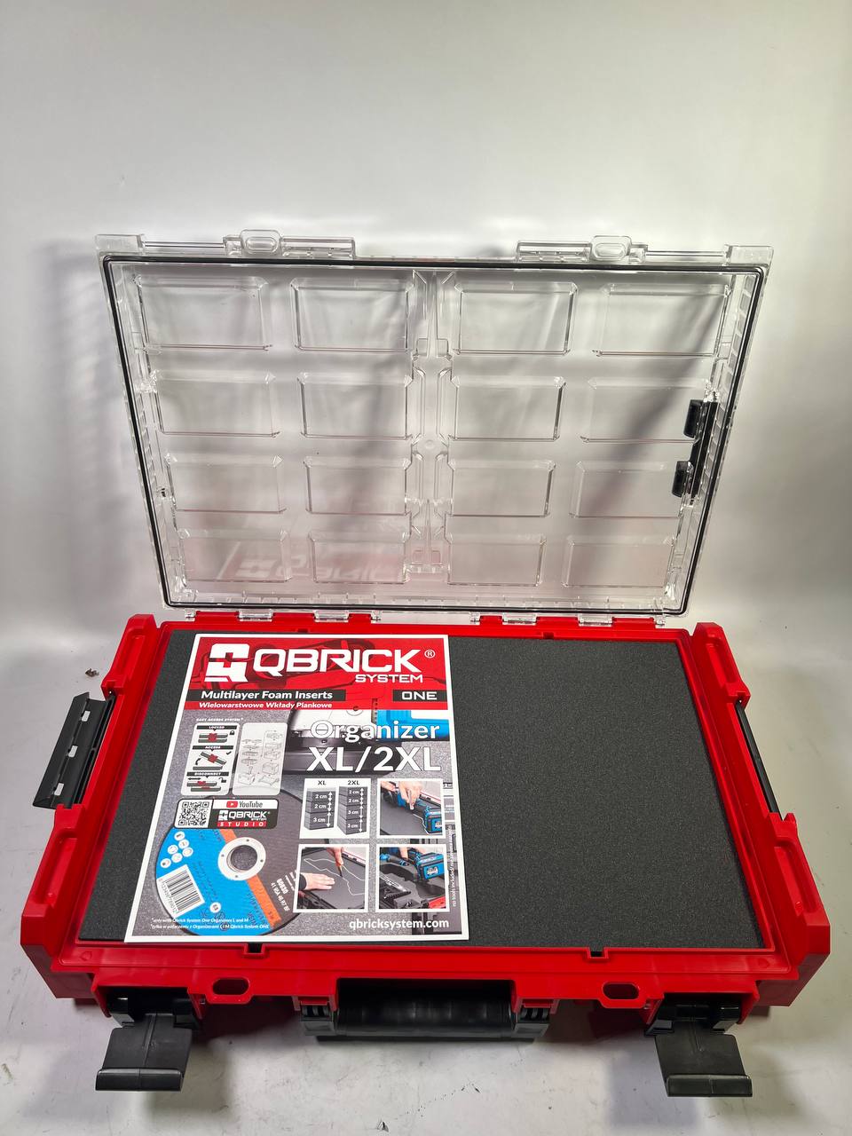 RED ULTRA HD is a special edition of Qbrick System ONE products made of ultra-resistant plastic, which is characterised by exceptional resistance to mechanical damage. The impact tests carried out confirm its exceptional durability, even in conditions below 0 °C. Qbrick System ONE Organiser XL Multilayer Foam Inserts is one of the largest organisers in the ONE line. System XL organisers can be combined with each other, but also with all other modules from the ONE line. The seal built into the polycarbonate cover offers full protection against the ingress of water and dust. Version 2.0 of the ONE product line is a new generation of toolboxes and organisers with a reinforced design. By additionally adapting the housings to M8 threaded inserts, the system can be customised to the user's needs. The custom version of this box model is equipped with four M8 threaded inserts that allow customisation by the user. The MFI version is equipped with multi-layer foam inserts that perfectly protect hand tools and power tools after the appropriate holes have been cut.