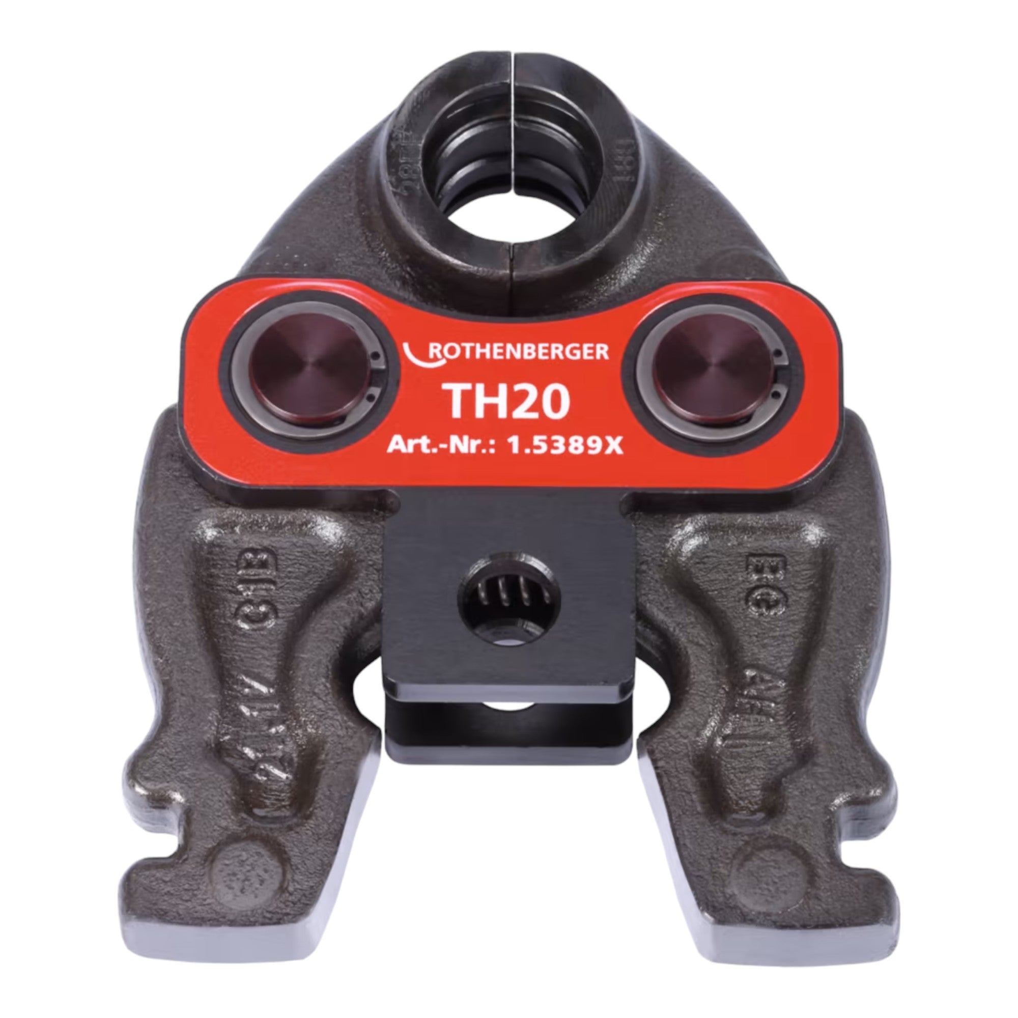 The Rothenberger TH 20 pressing jaw is a highly developed compact pressing jaw of the TH contour with a nominal width of 20 mm, which was specially developed for the system-compliant pressing of fittings for plastic pipe systems. Thanks to the innovative, partial laser hardening process called DURA LAZR TEC, the pressing jaw offers an extended service life and enables precise pressing. This process minimises wear within the pressing contour and doubles the pressing cycles compared to the previous model. Optimised corrosion protection guarantees the quality of the pressing jaw over its entire service life. The integration of the 3-bolt synchronised mechanism makes opening the pressing jaw particularly easy and convenient, which facilitates operation in daily use (one-finger operation). The Rothenberger pressing jaws are made of heavy-duty special steel and are compatible with all pressing machines that have a thrust force of 19 kN. These advanced features and high quality make the Rothenberger TH 20 pressing jaw an excellent choice for professionals who need reliable and durable tools for their plastic pipe systems.