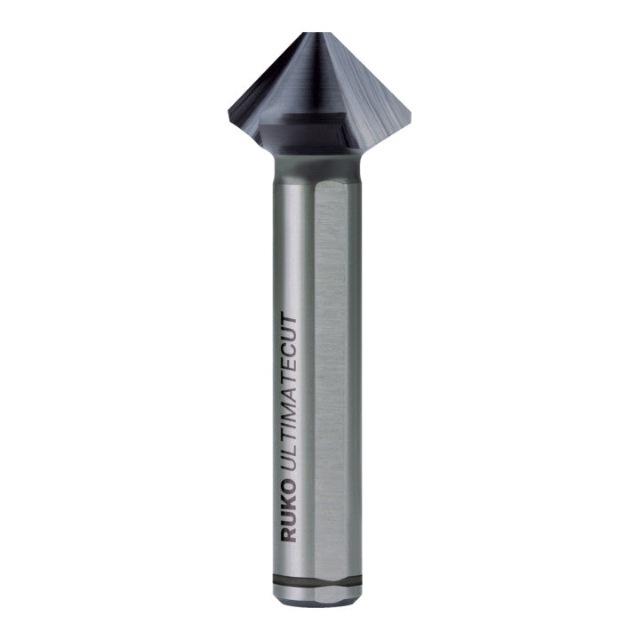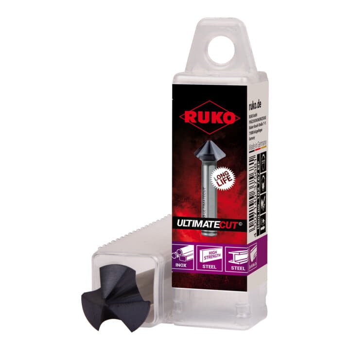 The completely newly developed cutting edge geometry of the ULTIMATECUT from RUKO greatly reduces the axial and radial forces acting on the tool during the countersinking process. The specially developed, variable undercut ensures a very smooth countersinking process. This produces a precise, round and chatter-free countersink surface and therefore guarantees the best results. Specially developed chip space parameters, such as rake angle, transition radius and the extra wide flute, ensure optimum chip and heat removal and thus enable very high wear resistance. The new geometry also counteracts material welding and reduces countersinking forces enormously. Significantly less feed force is now required during the countersinking process. Materials can be machined at either very high or low cutting speeds without any loss of countersinking quality. The ULTIMATECUT achieves the best performance in almost all materials and applications.