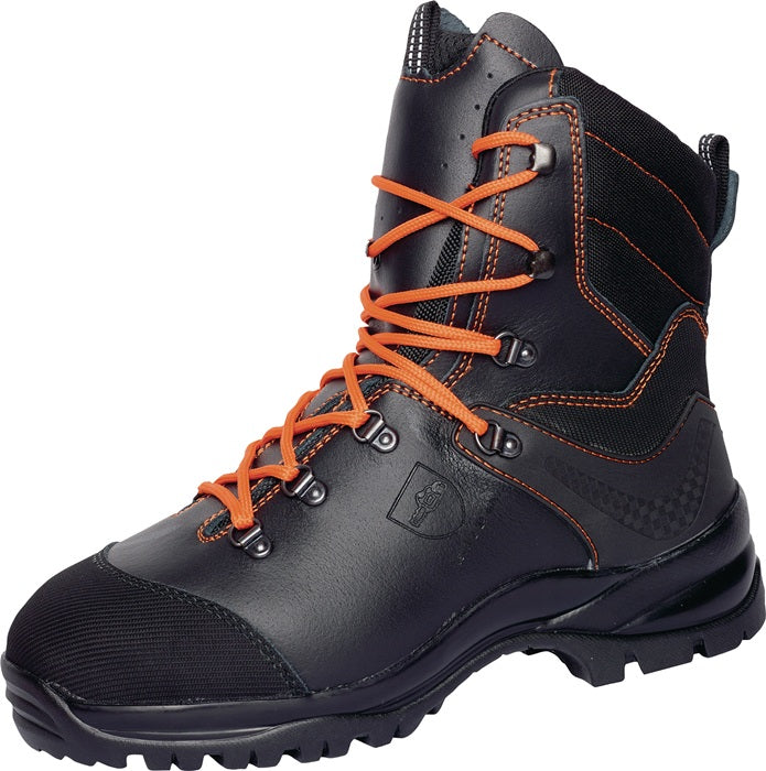 according to EN ISO 20345 - S3 HRO CI HI SRC - EN ISO 17249 - Saw protection: Class 2 (24 m/s) - Shaft height: approx. 23 cm - Shoe width: 10.5 - upper made from high-quality, hydrophobised smooth leather - padded collar made of CORDURA® textile material with flexible neoprene closure - padded dust flap made of full-grain leather and CORDURA® textile material - fastening with quick-lacing eyelets and hookseyelets and hooks - heel stabiliser - high-quality cut protection inlay - breathable textile lining and textile insole - removable and antistatic insole - pull-on aid on the tongue and heel - abrasion-resistant overcap - extra-wide, corrosion-free steel toe cap and fabric insole - antistatic, abrasion- and slip-resistant, oil- and acid-resistant, heat-resistant, profiled nitrile rubber outsole also available from size 39 to size 50 on request. 39 to size 50 available on request