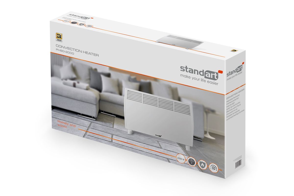 STANDART PH80-2000 is a white, mechanically controlled convection radiator with an output of 2.0 kW (2000 W). The radiator is suitable for heating rooms with a total area of no more than 20 m². There are two switches on the top of the radiator that regulate the operation of the radiator. There is a light under the switches that lights up when the radiator is switched on. The device can be operated in two heating levels (high and low). The advantages include protection against overheating and a relatively low weight, which does not restrict the radiator's mobility.