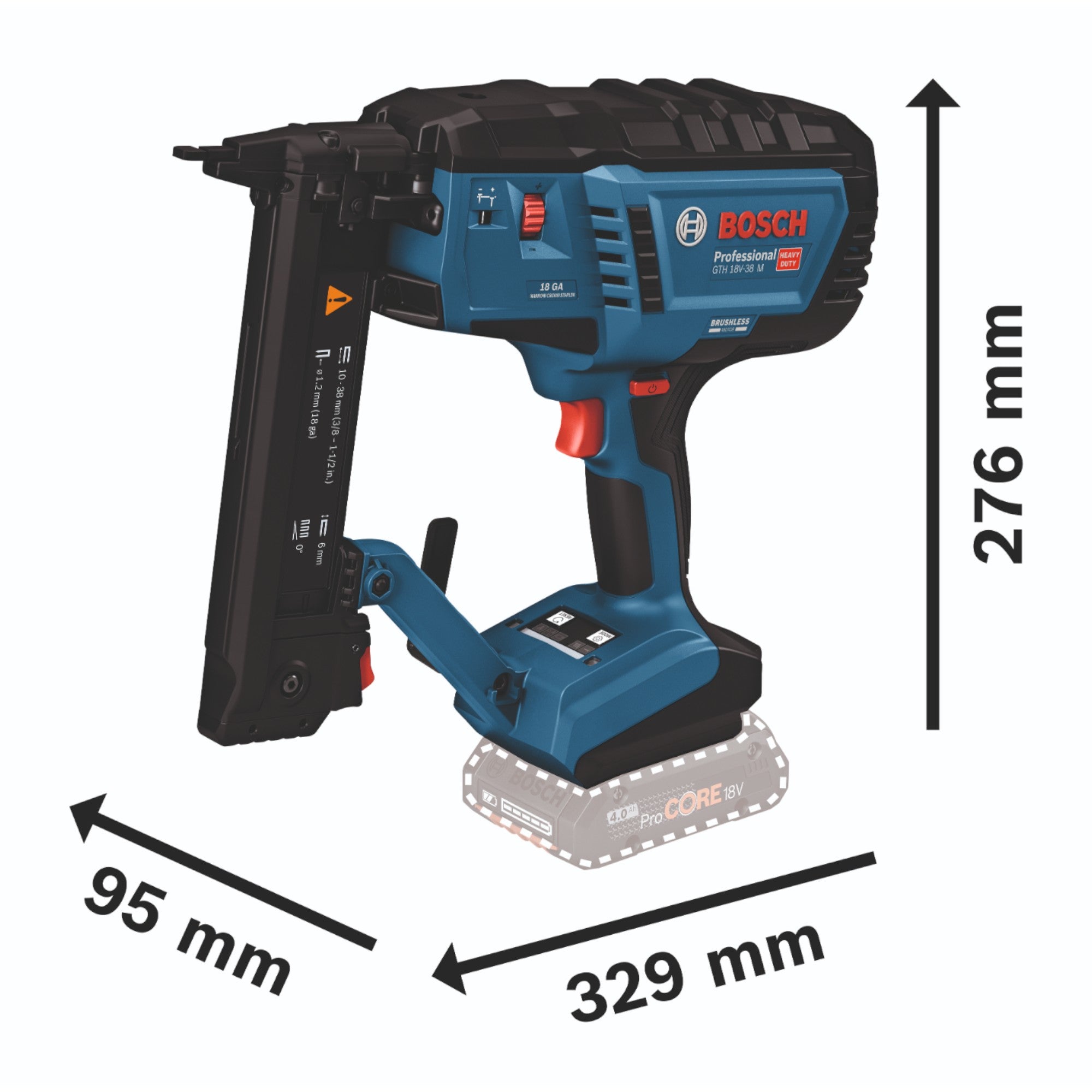 L'agrafeuse à bois sans fil GTH 18V-38 M Professional de Bosch offre une liberté professionnelle sans fil avec la puissance d'une agrafeuse à air comprimé - sans compresseur, cartouche de gaz ou câble. Équipée d'un puissant moteur sans balais et d'un très faible rebond, cette agrafeuse à dos étroit permet d'enfoncer les agrafes efficacement et en douceur, ménageant ainsi ton poignet et tes poumons. Grâce à l'interrupteur marche/arrêt actionnable avec le pouce, l'outil peut être mis en marche et utilisé confortablement d'une seule main, ce qui facilite considérablement son maniement. Le GTH 18V-38 M Professional offre toute la puissance d'un outil pneumatique et est idéal pour le montage de panneaux de plafond et de sol avec assemblage à rainure et languette (clouage caché), de parois arrière de meubles, de rembourrages, de clôtures en fil métallique ou en lattes fines, de grilles en bois et d'isolations acoustiques. De plus, elle est compatible avec le système 18V Bosch Professional et l'alliance de batteries AMPShare inter-marques, ce qui t'offre une flexibilité maximale. Les fonctions supplémentaires comprennent un réglage de la profondeur en continu facile à utiliser, un blocage de tir à sec, des doubles LED pour un éclairage optimal et une grande zone de visibilité au niveau de la pointe de contact. L'agrafeuse à bois convient pour des agrafes de 9,5 à 38 mm de longueur, un dos de 5,8 mm, 18 ga (1,2 mm) et un angle de magasin de 0°, ce qui en fait un outil polyvalent et indispensable pour les artisans professionnels.