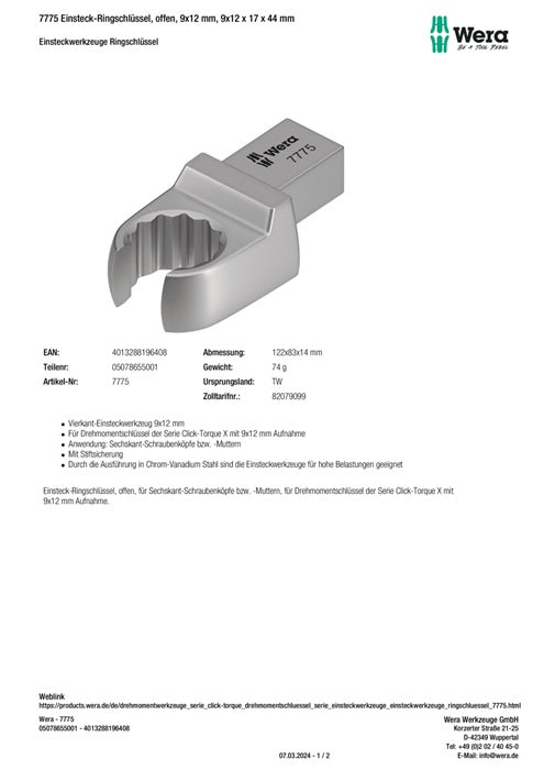 - 1x WERA clé polygonale à douille ouverture de clé 17 mm 9 x 12 mm