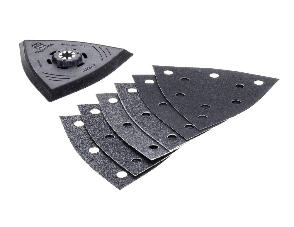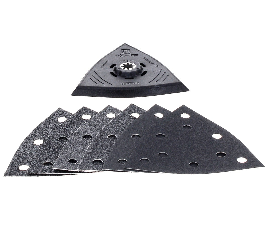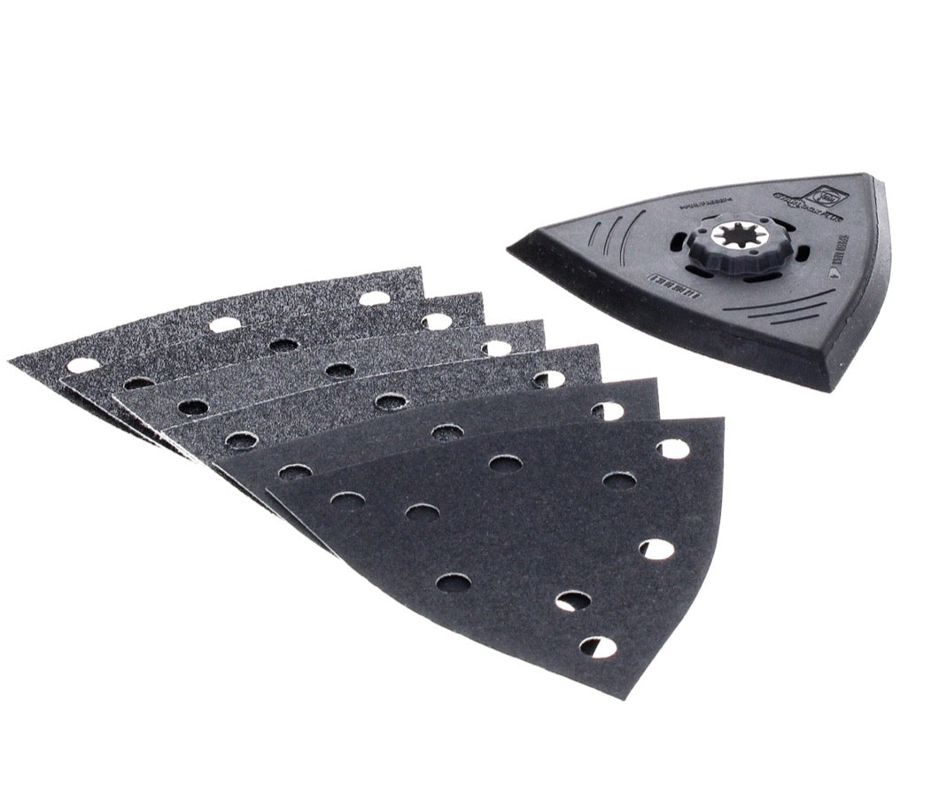 Le kit de ponçage FEIN contient une plaque de ponçage triangulaire d'une longueur d'arête de 130 mm et trois feuilles de ponçage différentes, chacune en double (grain 60, grain 80, grain 180). La plaque de support en plastique est utilisée pour éviter les dommages et les marques sur la pièce. L'ensemble de ponçage est idéal pour le ponçage économique des zones de bord et d'angle ainsi que des surfaces intermédiaires. L'ensemble ne promet aucun effet de rebond sur les bords, ainsi qu'une manipulation facile et un très bon enlèvement de matière. Grâce au support Starlock Plus, l'ensemble s'adapte à de nombreuses machines différentes et peut être assemblé sans outils.