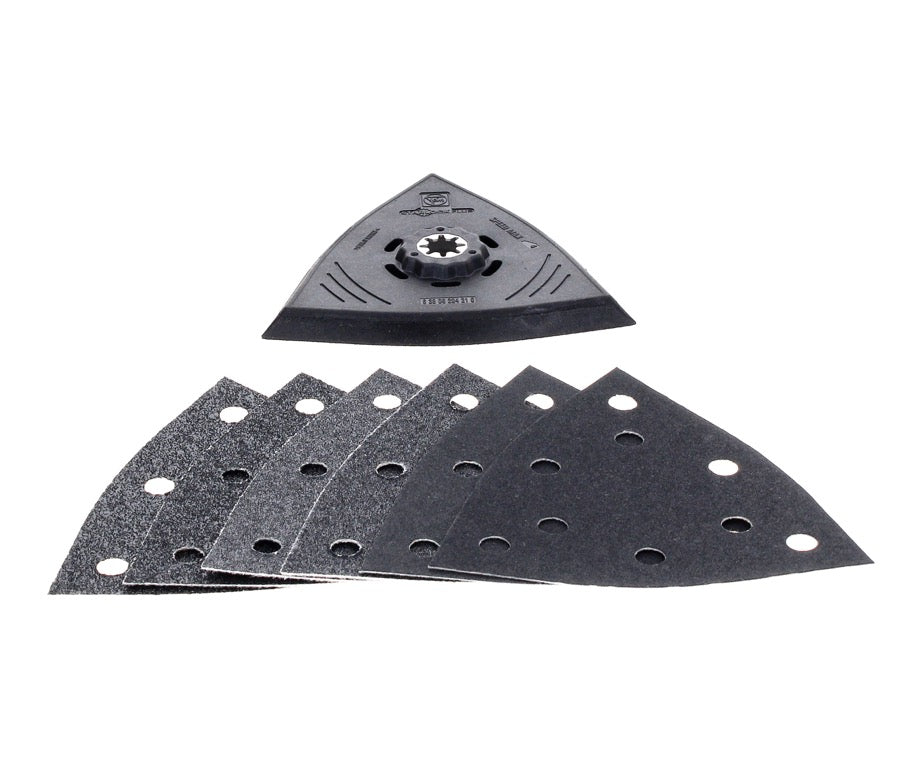 - 1x Patin de ponçage triangulaire perforé (longueur de bord 130 mm)