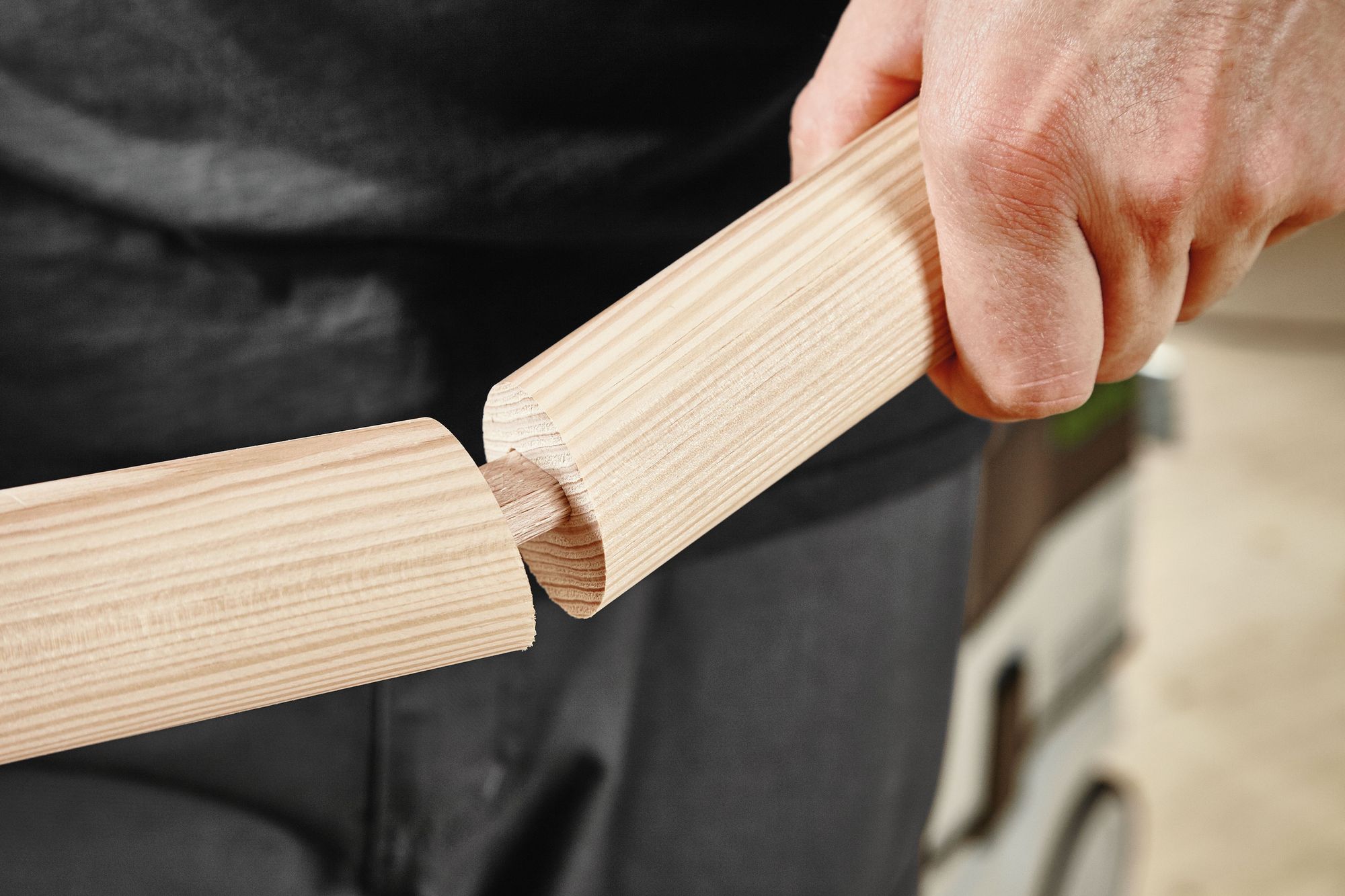 La forme spéciale, combinée aux poches de colle gonflées et aux rainures longitudinales, confère aux chevilles un maintien sûr. Pour des connexions absolument résistantes à la torsion et une stabilité maximale. Et avec un traitement nettement plus rapide : le premier trou de cheville est très facilement aligné et fraisé avec précision à l'aide de languettes de butée. Il fixe immédiatement les pièces à assembler exactement et au ras du bord. Le système DOMINO tolère également des imprécisions mineures dans les autres trous de chevilles.
