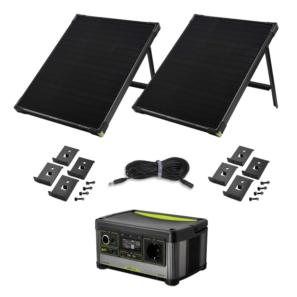 Le Goal Zero Yeti 500X est un appareil de stockage d'énergie portable au design compact qui vous permettra de rester facilement alimenté lors de longs séjours en camping, de garden-parties ou en déplacement en cas d'urgence. La batterie Li-ion NMC intégrée délivre 505 Wh à 10,8 V et 46,8 Ah. Une technologie de charge rapide innovante permet de charger rapidement divers appareils ou de fournir une alimentation électrique permanente. Pour rendre cela possible, le Yeti 500X dispose de diverses options de connexion telles que : 2x USB-A ; 2x USB-C ; Prise allume-cigare 12V et 1x prise UE 230V (120W). Vous pouvez charger le Yeti 500X à l'aide d'un module solaire de Goal Zero ou de manière traditionnelle à l'aide d'une prise de courant. Vous pouvez toujours garder un aperçu du Yeti 500X via l'écran intégré ; Là, vous pouvez visualiser le niveau de la batterie et surveiller le courant d'entrée et de sortie. Avec le module solaire Boulder 50 de Goal Zero, vous pouvez produire de l'électricité n'importe où en utilisant le soleil. Il est suffisamment durable pour une utilisation stationnaire, mais également suffisamment léger pour être emporté partout avec vous. Cela le rend parfait pour les caravanes, le camping, les chalets et bien d'autres domaines d'utilisation. Grâce au pied inclinable intégré, vous pouvez toujours aligner le module selon l'angle parfait par rapport au soleil. Les modules solaires Goal Zero impressionnent également par leur installation très simple ; Branchez simplement le câble de sortie de 8 mm dans le port d'entrée du Sherpa 100 AC et l'énergie que vous générez sera économisée. Étant donné que les modules sont constitués de cellules monocristallines, ils peuvent atteindre une efficacité allant jusqu'à 22 % en plein soleil par rapport aux cellules polycristallines. Le câble d'extension Goal Zero est un câble d'extension pour les modules solaires Boulder et Nomad. Il a une longueur d'environ 9,1 mètres (30 pieds) et une taille d'entrée et de sortie de 8 mm. Le câble est très robuste et a une couleur noire simple. Il est idéal pour connecter le panneau et la batterie externe sur de longues distances. De plus, plusieurs modules solaires peuvent être connectés entre eux avec ce câble. Le kit de montage Goal Zero fourni convient à l'installation des modules solaires Boulder 50 et Boulder 100. Quatre supports avec fixations associées sont inclus et sont idéaux pour installer les panneaux solaires sur les toits des véhicules, les tonnelles ou des endroits similaires. Goal Zero s'engage à créer un avenir intelligent, sûr et durable avec des solutions d'alimentation portables accessibles à tous à tout moment.
