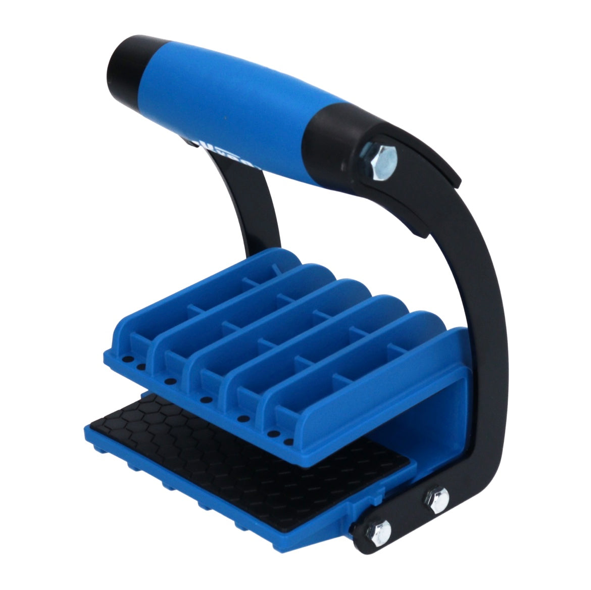 Kreg propose le KMA300, un porte-panneaux pratique qui permet de porter facilement de grands panneaux ou du contreplaqué d'une taille allant jusqu'à 120 x 240 cm. La fixation du bois est très simple et le porte-panneaux s'adapte automatiquement à l'épaisseur du matériau. Ses coussinets sont recouverts de Kreg GripMaxx™ pour assurer un maintien solide et sûr sans endommager le matériau ni laisser de traces. De plus, plus vous soulevez la poignée, plus les coussinets se resserrent pour éviter tout glissement. Sa poignée ergonomique est dotée d'un rembourrage épais et durable et ne s'enfonce pas dans votre main lorsque vous transportez votre matériau. Kreg est l'un des principaux fabricants d'outils pour la fabrication de meubles haut de gamme, qui se distingue avant tout par sa longue tradition et son excellente qualité de fabrication.