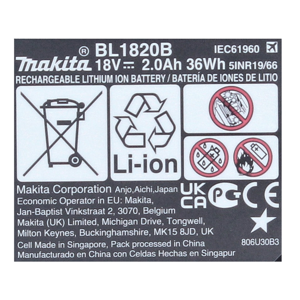 - 1x Makita BL 1820 B Batterie Li-Ion avec témoin de charge LED 18 V - 2 Ah / 2000 mAh (197254-9)