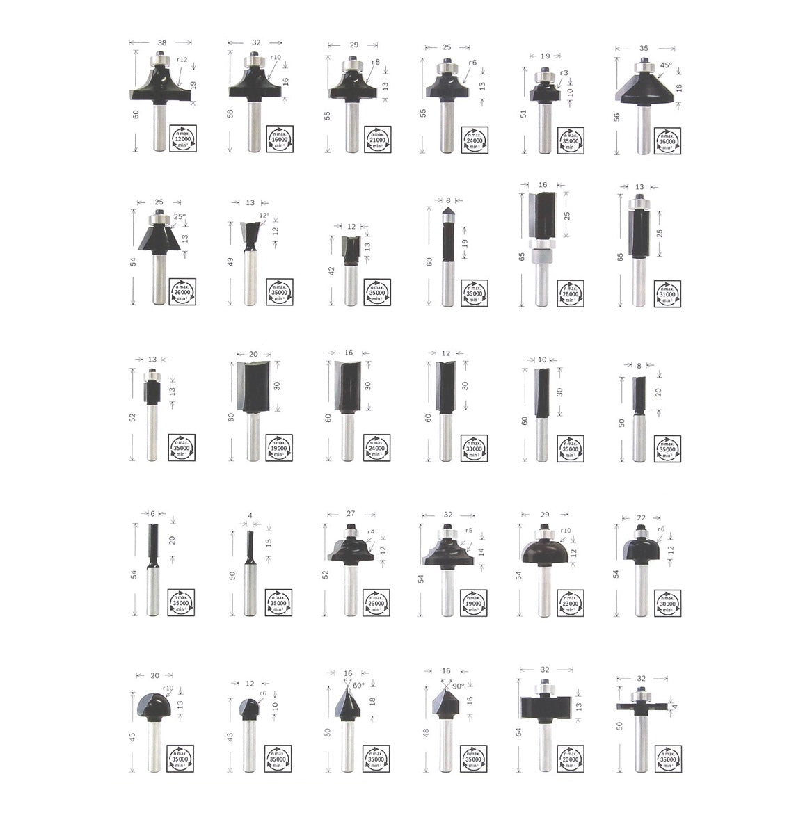 - 5x fraises à arrondir 10 x 19 mm ( R= 3 mm ) / 13 x 25 mm ( R= 6 mm ) / 14 x 29 mm ( R= 8 mm ) / 16 x 32 mm ( R= 10 mm ) / 19 x 38 mm ( R= 12 mm )