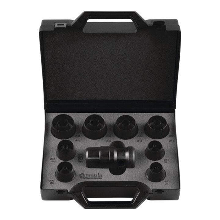 1 crochets 1 poinçon intérieur dans les tailles 3 / 4 / 6 / 8 / 10 mm 1 poinçon extérieur dans les tailles 12 / 14 / 16 / 18 / 20 / 22 / 24 / 26 / 28 / 30 / 32 / 34 / 36 / 38 / 40 mm