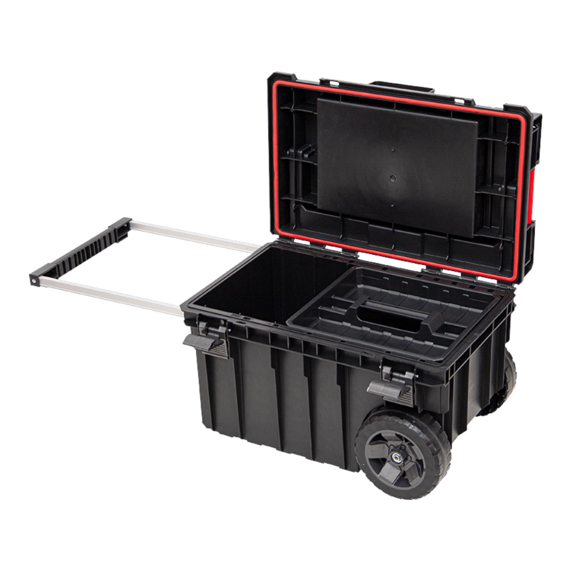 Grande caisse à outils sur roulettes pour une excellente mobilité des systèmes de kits Qbrick. Deux roues à inertie montées sur un axe métallique permettent de transporter en toute sécurité des jeux de boîtes et des organisateurs. Le mécanisme simple de la poignée coulissante du double télescope s'enclenche lorsque vous frappez légèrement la poignée par le bas. Le contenu de la boîte est doté d'une coque pratique et d'un joint flexible qui protège le contenu de la boîte contre la pénétration de la poussière et de l'eau. Le nouveau couvercle EXPERT offre de nouvelles possibilités de rangement. Équipé de 8 seaux de différentes tailles, il permet de ranger les petites fournitures d'atelier et les fournitures plus longues. La longue poignée en aluminium assure une grande ergonomie lors du transport.