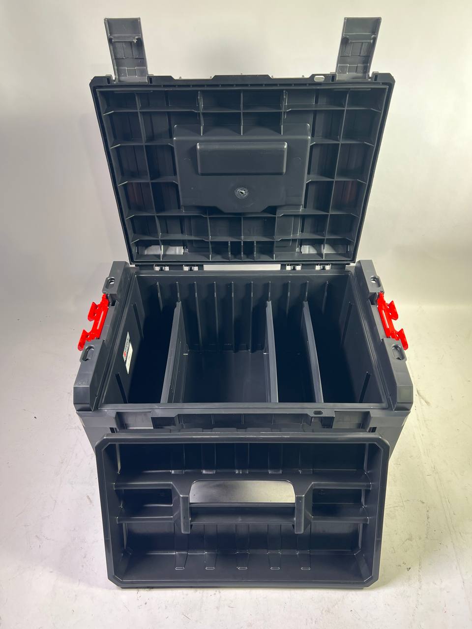 La boîte à outils Qbrick System PRO est une boîte à outils spacieuse et modulaire qui offre déjà en standard une large gamme d'accessoires : un joint flexible intégré dans le couvercle qui garantit une grande résistance à la pénétration de la poussière et de l'eau, 3 compartiments réglables, un plateau spacieux et des éléments de connexion et de fixation latéraux en polyamide super résistant à l'avant. Des glissières spéciales dans la boîte à outils QS PRO vous permettent de placer les Multi Organizer QS TWO, qui servent à ranger les petits accessoires d'atelier.