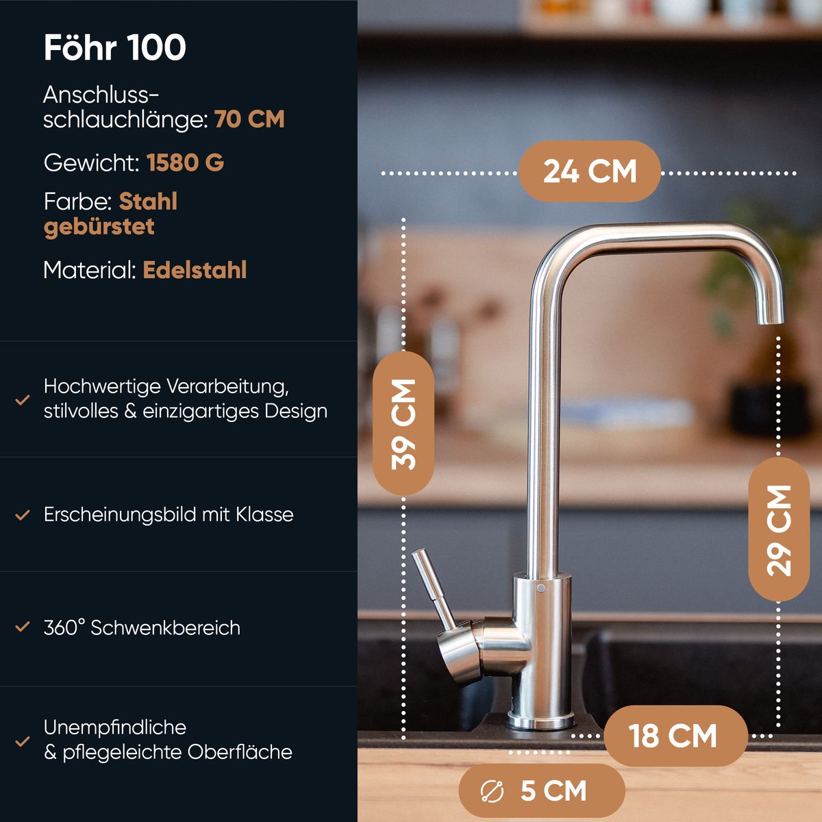 Le robinet de cuisine Föhr 100 de la maison Rosenhahn & Söhne allie longévité et design moderne. Il est doté d'une zone pivotante qui permet d'atteindre facilement n'importe quel endroit à l'intérieur et à l'extérieur de l'évier. De plus, il est possible de l'utiliser de n'importe quel côté et de le faire pivoter pour plus d'espace ! Son design élégant en acier  brossé et sa finition de qualité en laiton font de notre robinet d'évier un véritable accroche-regard. Ce robinet dispose également d'un alliage qui le protège contre les résidus de calcaire et de rouille. Il est livré avec un guide d'utilisation détaillé et illustré pour vous aider à l'installer sans problème.