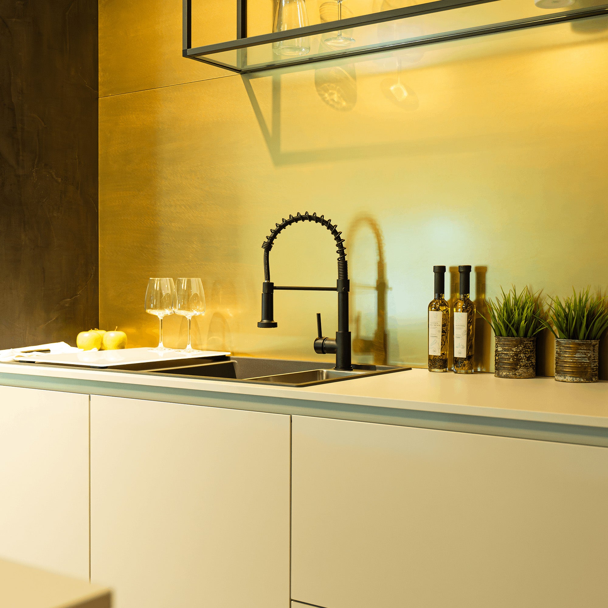 Le robinet de cuisine Sylt 100 de la maison Rosenhahn & Söhne allie longévité et design moderne. Il est doté d'une zone pivotante qui permet d'atteindre facilement n'importe quel endroit à l'intérieur et à l'extérieur de l'évier. De plus, il est possible de l'utiliser de n'importe quel côté et de le faire pivoter pour plus d'espace ! Son design élégant en noir mat et sa finition de qualité en laiton font de notre robinet d'évier un véritable accroche-regard. Ce robinet dispose également d'un alliage qui le protège contre les résidus de calcaire et de rouille. Il est livré avec un guide d'utilisation détaillé et illustré pour vous aider à l'installer sans problème.