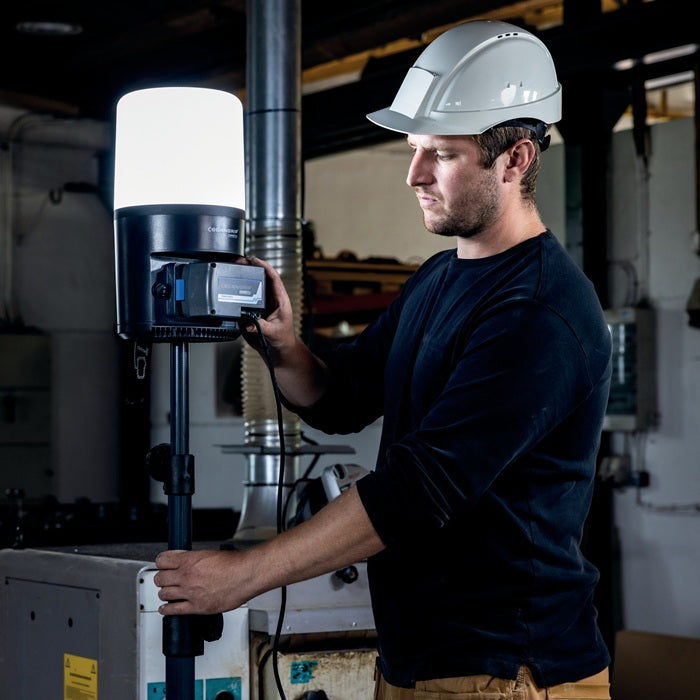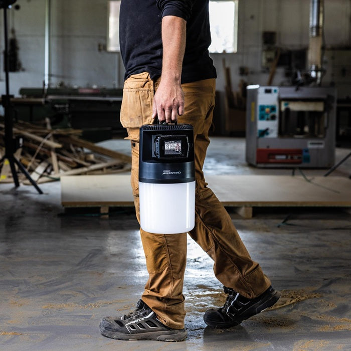 Lampe de travail 360° de 6000 lumens pour packs d'accus 18 V - lumière de travail diffuse et uniforme - deux niveaux d'éclairage (50-100 %) - crochet pour un placement flexible sur le SCANGRIP-TRIPOD - indice de protection IP65 - livrée sans accu/connecteur