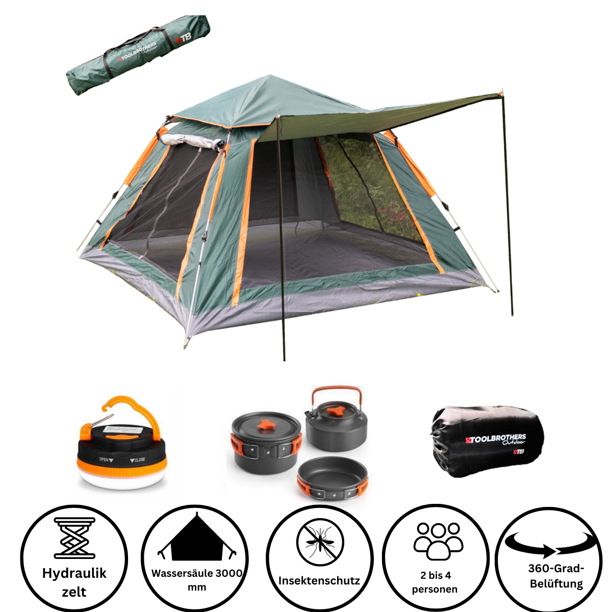 Toolbrothers Outdoor Camping-Set Tente pour 2-4 personnes Tente hydraulique Pop-Up + équipement de camping 13 pcs.