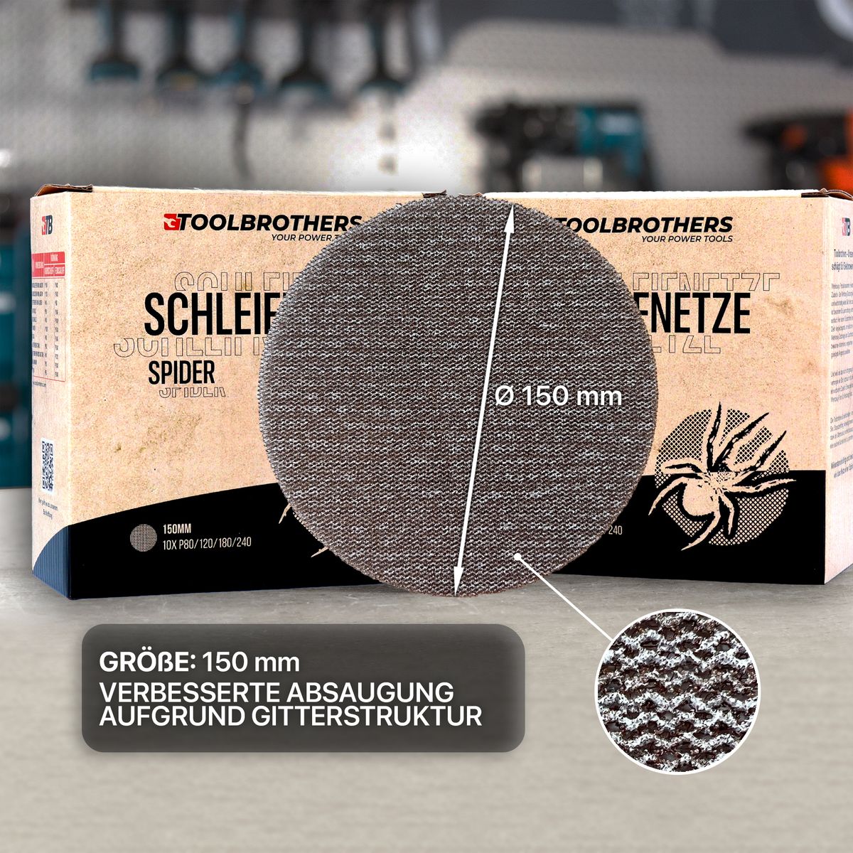 Toolbrothers SPIDER Set de ponçage filet 150 mm Velcro 10x P80 / P120 / P180 / 240 pour bois dur, bois tendre, vernis, pierre, acier, aluminium, placage