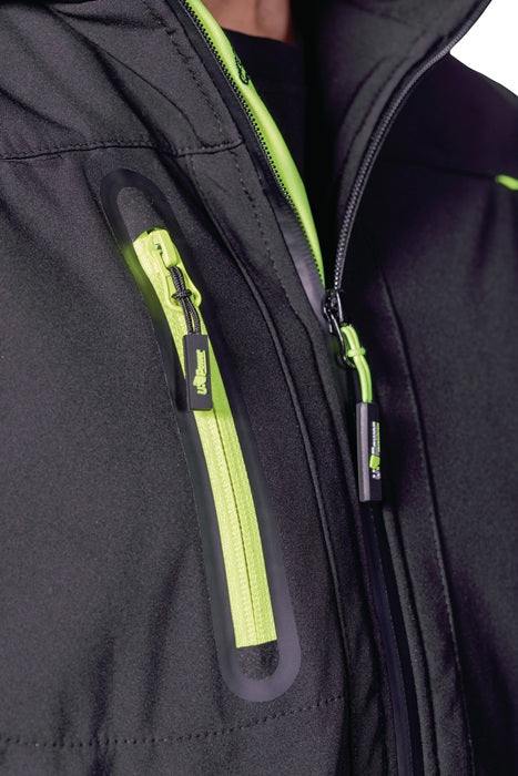 96% polyester / 4% spandex, env. 320 g/m² - avec membrane U-Tex - tissu déperlant, perméable à l'air et coupe-vent - veste très confortable et résistante avec doublure en micropolaire douce et lumineuse - fermeture centrale par zip étanche - inserts réfléchissants pour une visibilité maximale - manches préformées pour un ajustement optimal - capuche réglable et amovible - élastiques, poignets coupe-vent avec trou pour le pouce et fermeture velcro - équipé de deux poches fermées à l'avant avec fermeture éclair lumineuse et cordon de serrage dans les poches pour éviter de s'accrocher - poche pour téléphone portable sur la poitrine avec technologie Free Sound et pouvant être fermée avec une fermeture éclair lumineuse - deux grandes poches intérieures - une poche supplémentaire soudée sur la manche gauche - bande réfléchissante sur le col