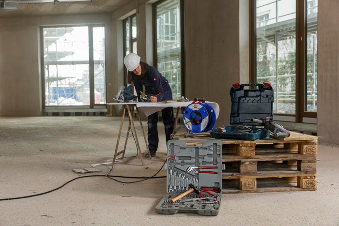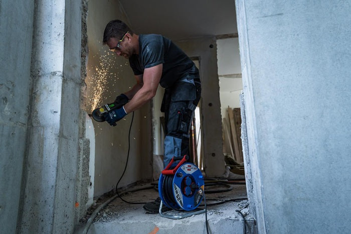 L'avvolgicavo Garant IP44 per uso commerciale/cantiere con 25 m di cavo nel colore blu di Brennenstuhl convince per la sua qualità e sicurezza in tutti i settori. L'avvolgicavo è ideale per l'uso in cantieri e all'aperto. Inoltre, convince per le seguenti caratteristiche: Innovativa maniglia di trasporto ″cablepilot″ per un perfetto passaggio dei cavi. Oscilla su entrambi i lati e consente di trasportare e appendere comodamente il cavo RN è omologato per condizioni di costruzione difficili in conformità alla norma VDE 0100 Parte 704 Con maniglia di rotazione per un comodo avvolgimento Classe di protezione IP44 Lunghezza del cavo 25 m Designazione del cavo H07RN-F 3G2.5 Qualità del cavo Gomma-neoprene Colore del cavo Nero Diametro del tamburo 290 mm