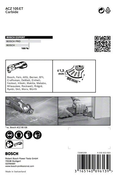 La lama a segmenti EXPERT Multi Material ACZ 105 ET offre una durata eccezionale nei materiali abrasivi e compositi grazie alla tecnologia Bosch Carbide. Un rivestimento supplementare la rende ancora più resistente, con una durata di vita fino a 50 volte superiore a quella di una lama bimetallica. Il design più spesso della lama fornisce ulteriore robustezza e stabilità. Questo assicura tagli precisi e dritti. Inoltre, il supporto Starlock assicura la massima trasmissione di potenza e un comodo cambio di lama in pochi secondi e può essere utilizzato con molte macchine grazie al sistema di montaggio tra produttori diversi. La gamma EXPERT di Bosch è l'accessorio più innovativo per gli elettroutensili con vantaggi comprovati in termini di prestazioni per consentire ad ogni artigiano professionista di lavorare in modo altamente efficiente. Durata estremamente lunga, massima precisione, lavoro alla massima velocità e levigatura senza polvere: tutto questo è possibile con Bosch EXPERT.
