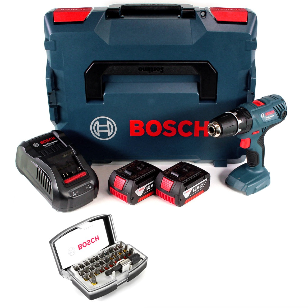 Bosch GSB 18 V-21 Trapano professionale avvitatore con percussione a batteria in valigetta L-Boxx + 2x Batterie 3,0Ah + Caricabatterie GAL 1880 CV + Set di punte Wiha Dinotech Edition da 32 pezzi