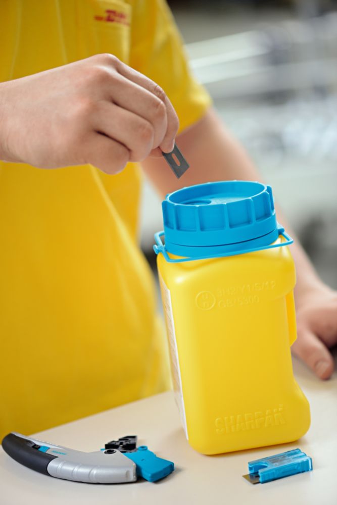una spaziosa cassetta di plastica per la raccolta, lo stoccaggio e lo smaltimento delle lame usate - quando la cassetta è piena, il coperchio può essere chiuso fino all'arresto, quindi la cassetta non può più essere aperta - il contenitore di raccolta con le lame può essere smaltito in modo sicuro e completo