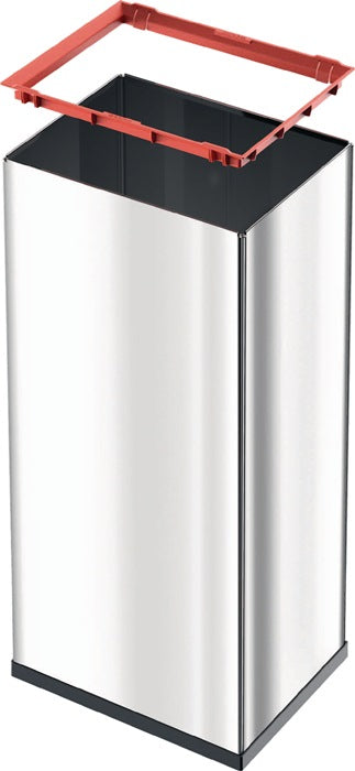 Contenido 52 l · Tapa y fondo de plástico negro de alta resistencia · Carcasa de chapa de acero con recubrimiento en polvo · La tapa abatible de dos piezas se cierra automáticamente y se puede bloquear para una apertura completa de la tapa abatible · Con marco de sujeción para bolsas de basura · Base con 4 pies antideslizantes · Se entrega desmontado, fácil de montar