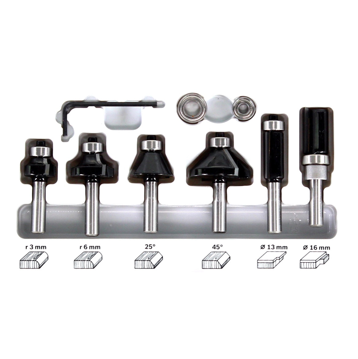 - 1x juego de fresas para cantos y cantos Bosch de 6 piezas de 8 mm (2607017469) compuesto por: