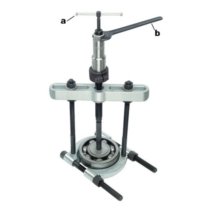 Applicazione: per l'estrazione di cuscinetti a sfera, cuscinetti a rulli, anelli interni e altre parti a filo - i taglienti affilati consentono di estrarre parti a filo dove non è possibile utilizzare estrattori a 2 o 3 bracci (Fig. 1) - le ganasce vengono bloccate tirando uniformemente i dadi sui bulloni laterali Metodo di lavoro: l'estrazione avviene stringendo il mandrino contro l'estremità dell'albero (Fig. 2 e 3), anche con funzionamento idraulico. 1) - le ganasce vengono bloccate tirando uniformemente i dadi sui bulloni laterali Metodo di lavoro: l'estrazione avviene stringendo il mandrino contro l'estremità dell'albero (Fig. 2 e 3), con gli estrattori più grandi è possibile anche il funzionamento idraulico Metodo di lavoro con impianto idraulico (Fig. 4): (l'impianto idraulico non è compreso nella fornitura) avvitare con la chiave (b) il mandrino dell'impianto idraulico nella filettatura della traversa dell'estrattore - fino a quando l'elemento di pressione preme con forza contro l'albero, quindi attivare l'impianto idraulico ruotando il mandrino superiore (a) - Attenzione: le figure 2 e 3 mostrano il separatore in combinazione con l'estrattore Art.4157 490 000, 4157 490 001, 4157 490 002, 4157 490 003 (non compresi nella fornitura) - Attenzione: le figure 2 e 3 mostrano il separatore in combinazione con l'estrattore Art. n. 4157 490 000, 4157 490 001, 4157 490 002, 4157 490 003 e un mandrino idraulico (l'estrattore e il mandrino idraulico non sono compresi nella fornitura).
