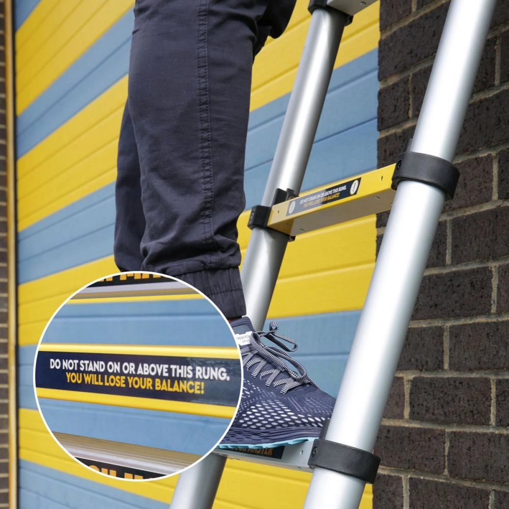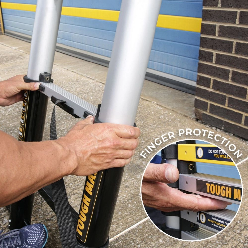 La escalera telescópica TOUGH MASTER ML-1004A es difícil de superar en cuanto a facilidad de uso, durabilidad y su impresionante tamaño. Gracias a los perfiles de aluminio de 1,3 mm de espesor, la escalera puede soportar una carga máxima de 150 kg. Además, la escalera alcanza una altura máxima de 3,8 m cuando está completamente extendida, que es más alta que la mayoría de las escaleras extensibles. Para un uso seguro, la escalera ha sido equipada con algunas características de seguridad. Para que pueda ver inmediatamente la altura máxima a subir, la escalera tiene marcas de color amarillo claro. La barra estabilizadora situada en la base de la escalera garantiza un uso estable, mientras que los pies de goma antideslizantes integrados proporcionan aún más agarre, especialmente cuando se utiliza la escalera en ángulo. Además, el mecanismo de bloqueo fuerte y seguro garantiza la seguridad durante el uso. Para evitar pellizcarse los dedos al doblar la escalera, los peldaños de la escalera están separados por 1 pulgada. Esta escalera definitivamente no le defraudará en lo que respecta a su próximo trabajo. Es fácil de cerrar y su tamaño compacto facilita su transporte y almacenamiento. Otras características incluyen el práctico cierre de botón, con el que se puede plegar fácilmente la escalera hasta una longitud compacta de 118 cm pulsando 2 botones. Además, la escalera es fácil de transportar gracias a su reducido peso de 15,87 kg y la correa incluida mantiene la escalera unida.