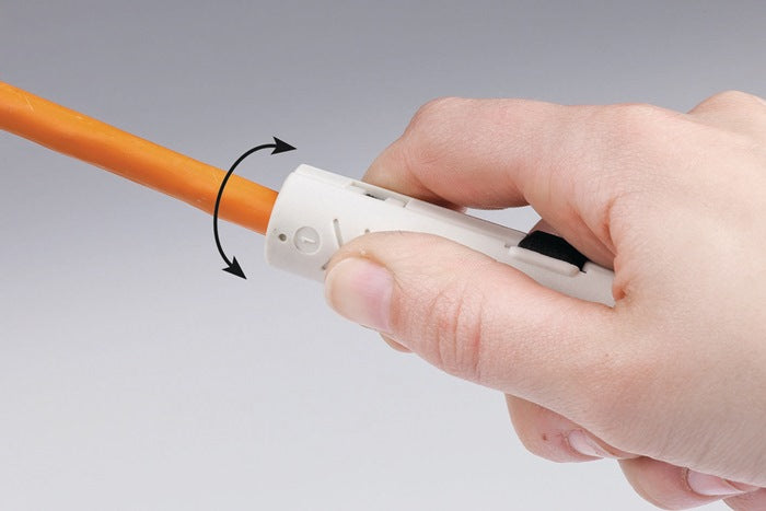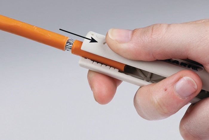 per la spelatura di cavi dati isolati in PVC - lame rivestite in nitruro di titanio, quindi maggiore velocità di taglio, minore usura, maggiore durata - con scala delle lunghezze - 2 coppie di lame per la schermatura della guaina esterna e del foglio di alluminio