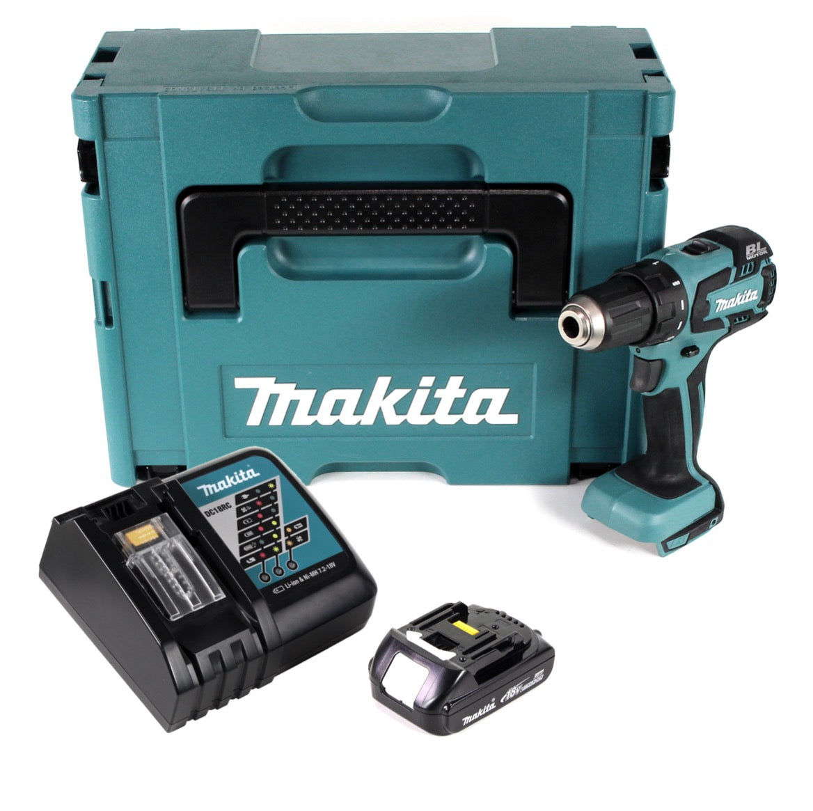 Akumulatorowa wiertarko-wkrętarka Makita DDF 459 Y1J 18V 45Nm w zestawie Makpac + 1x akumulator 1,5 Ah + ładowarka