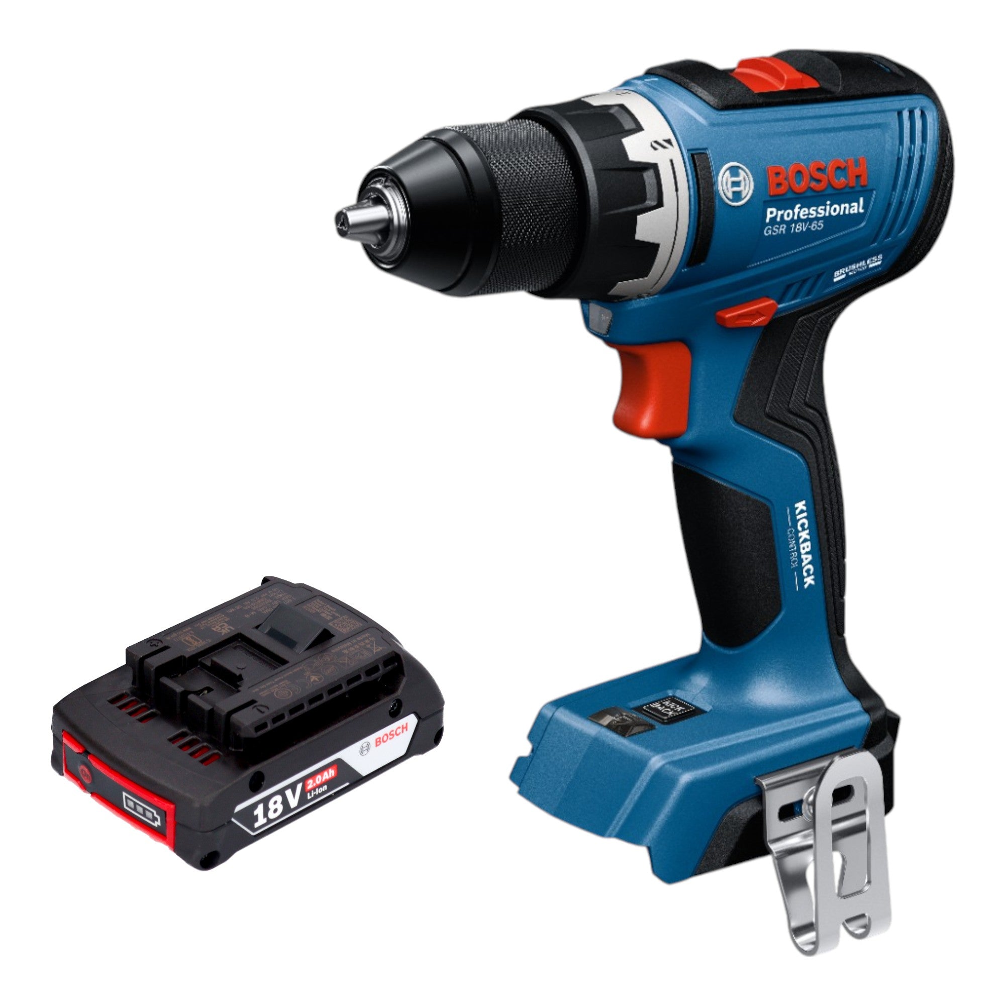 Bosch GSR 18V-65 Profesjonalna akumulatorowa wiertarko-wkrętarka 18 V 63 Nm bezszczotkowa + 1x akumulator 2,0 Ah - bez ładowarki