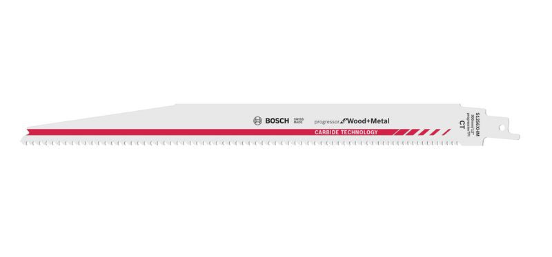 La hoja de sierra alternativa Bosch S 1256 XHM Progressor para madera y metal ofrece la máxima durabilidad. Gracias a los dientes de carburo rectificados, cortar acero y madera de alta resistencia no supone ningún problema. Los dientes dispuestos progresivamente permiten cortes rápidos en materiales de diferentes espesores. El cuerpo ancho y cónico y el espesor de pared grueso proporcionan la estabilidad necesaria durante los trabajos de demolición. Los dientes de la hoja de sierra se soldaron al cuerpo de acero altamente elástico mediante Carbide Technology. Gracias a la longitud total de 300 mm, es posible un rendimiento de corte de hasta 250 mm. Gracias al sistema de eje universal de 0,5 pulgadas, la hoja de sierra es compatible con las sierras alternativas más comunes.