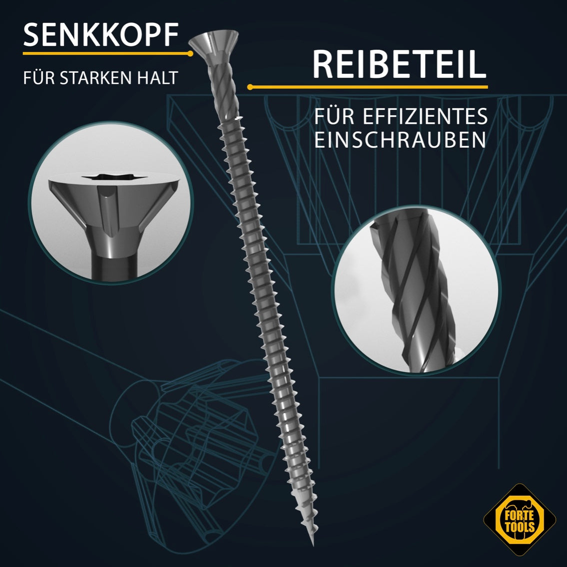 Wkręt do drewna FORTE Tools z wgłębieniem Torx gwarantuje użytkownikowi wysoki stopień elastyczności dzięki uniwersalnemu zastosowaniu w różnych materiałach, takich jak drewno, plastik czy blacha. Łeb stożkowy zapewnia czyste i równe pogłębienie wkrętu w drewnie. Gniazdo Torx zapewnia lepsze przenoszenie siły na wkręt, dłuższą żywotność i szybsze gwintowanie wkrętu z lepszym dopasowaniem do obrabianego elementu. Ponadto profil falisty na gwincie przednim zapewnia łatwe i bezpieczne wkręcanie. Galwanizacja zapewnia ochronę przed korozją i znacznie wyższą twardość powierzchni niż w przypadku konwencjonalnych gołych śrub, co oznacza, że zakres zastosowań można wielokrotnie rozszerzyć w obszarach zewnętrznych.Dane techniczne: