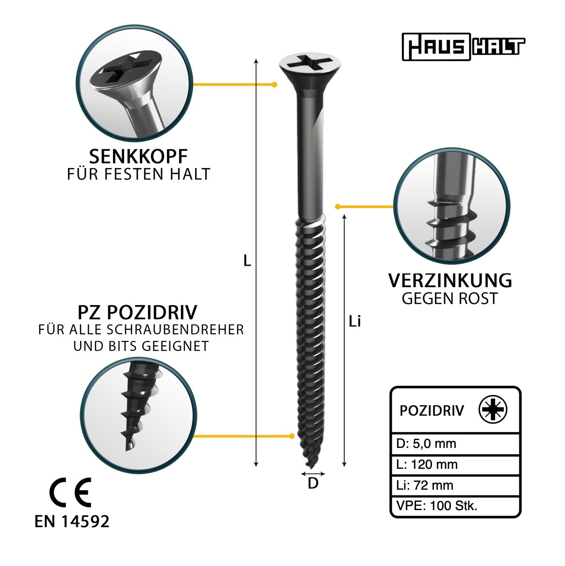 HausHalt uniwersalny wkręt budowlany do drewna 5.0 x 120 mm PZ2 100 szt. ( 000051371185 ) srebrny ocynkowany wgłębienie krzyżowe Pozidriv łeb stożkowy gwint częściowy