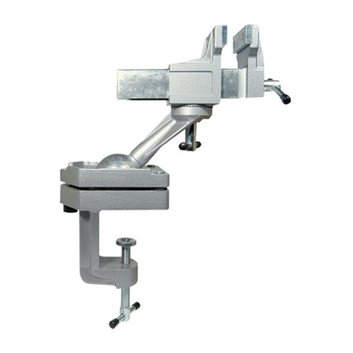 Małe imadło z przegubem kulowym - możliwość mocowania za pomocą dźwigni zaciskowej - możliwość obracania o 360° i obracania o 90° - imadło i wspornik mocujący lub przykręcana płyta wykonane ze stopu metali lekkich - wykończenie młotkowe - ukryty trzpień stalowy - szczęki otwierane do przodu - z wymiennymi szczękami z tworzywa sztucznego - nr art. 4000 830 976 z aluminiowymi blokami obrotowymi/zaciskowymi