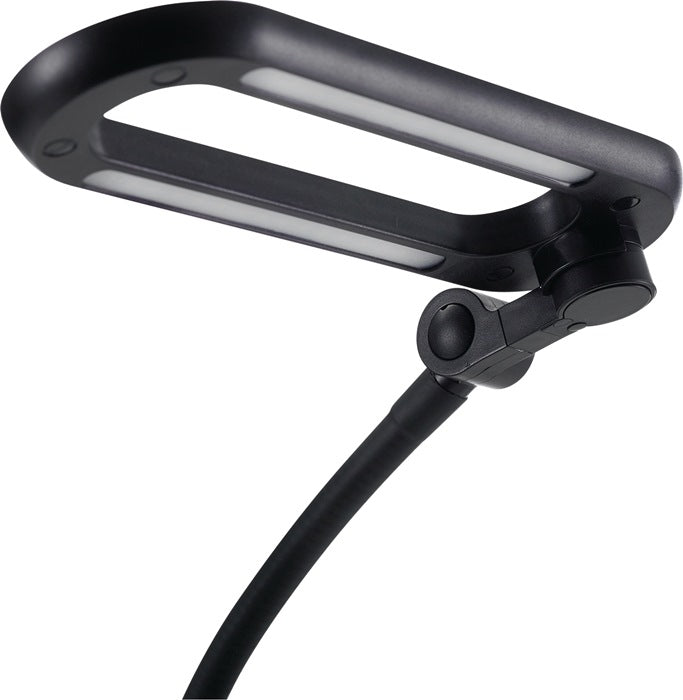 z kablem przyłączeniowym o długości ok. 3 m - wersja szeroka - do optymalnego oświetlenia miejsca pracy na dużej powierzchni - głowica lampy z 3 przegubami i elastycznym wężem o długości 600 mm oraz kablem przyłączeniowym H05RN-F 2G1.0 o długości 3 m - oświetlany obiekt można kontrolować bezpośrednio przez głowicę lampy Parametry techniczne: 230 V, szeroka dioda LED o mocy 9 W, 230 V / 12 V, 3 poziomy jasności: 100% (750 lumenów), kąt wiązki 100°, barwa światła 6.300 K, natężenie oświetlenia 100%=302 luksy, 60%=178 luksów, 35%=108 luksów (1 m)